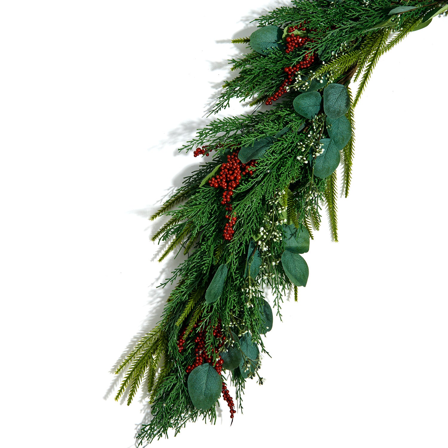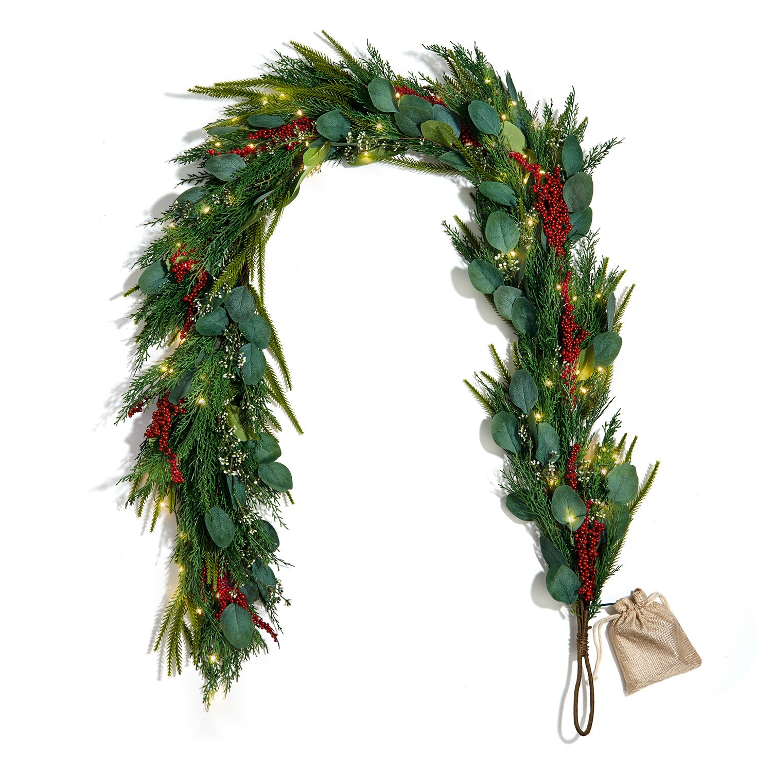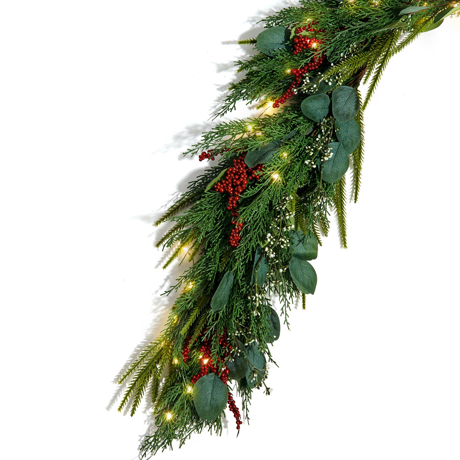• One 72" long garland of lush artificial cypress, seeded eucalyptus, and hemlock, topped with red winterberries, and pre-lit with warm white LED fairy lights